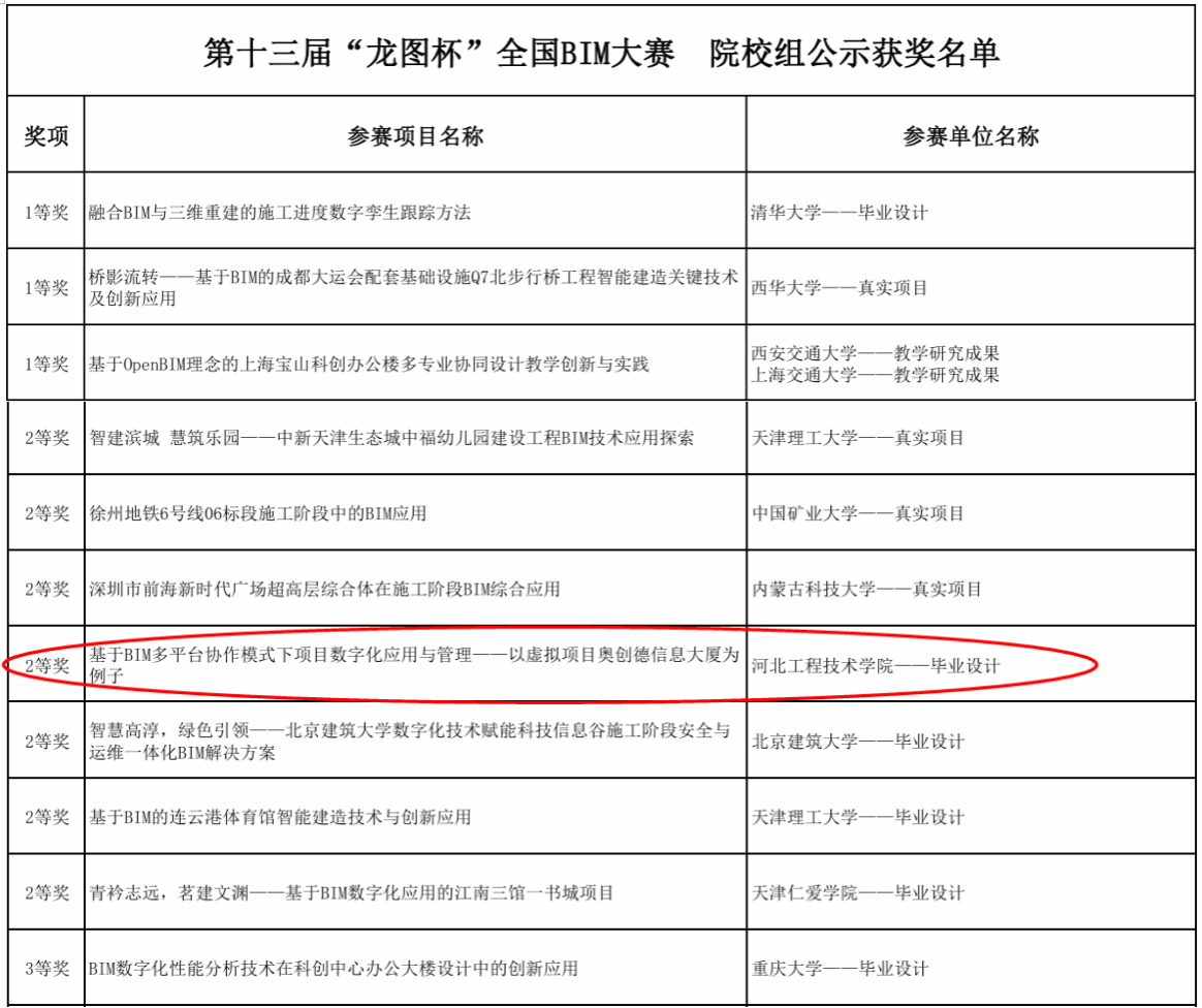 近日,第十三届“龙图杯”全国BIM大赛落下帷幕,由BEAT365英国官网赵利军老师指导参赛的两支队伍发挥出色,荣获全国二等奖和优秀奖。
