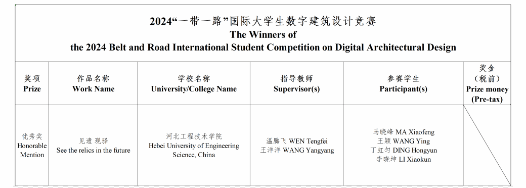 由“一带一路”建筑类大学国际联盟(BRAUIC)发起,北京建筑大学主办、丝路国际公益基金等单位协办、联合国教科文组织等单位支持的2024“一带一路”国际大学生数字建筑设计竞赛获奖名单公布,BEAT365官网荣获优秀组织奖。此次赛事中,我院共组织12名学生,4位指导教师参与此次竞赛,其中马晓峰、王颖、丁虹匀、李晓坤学生团队参赛作品《见遗 现驿》荣获数字化建筑设计方向优秀奖,指导教师温腾飞、王洋洋荣获优秀指导教师奖。
