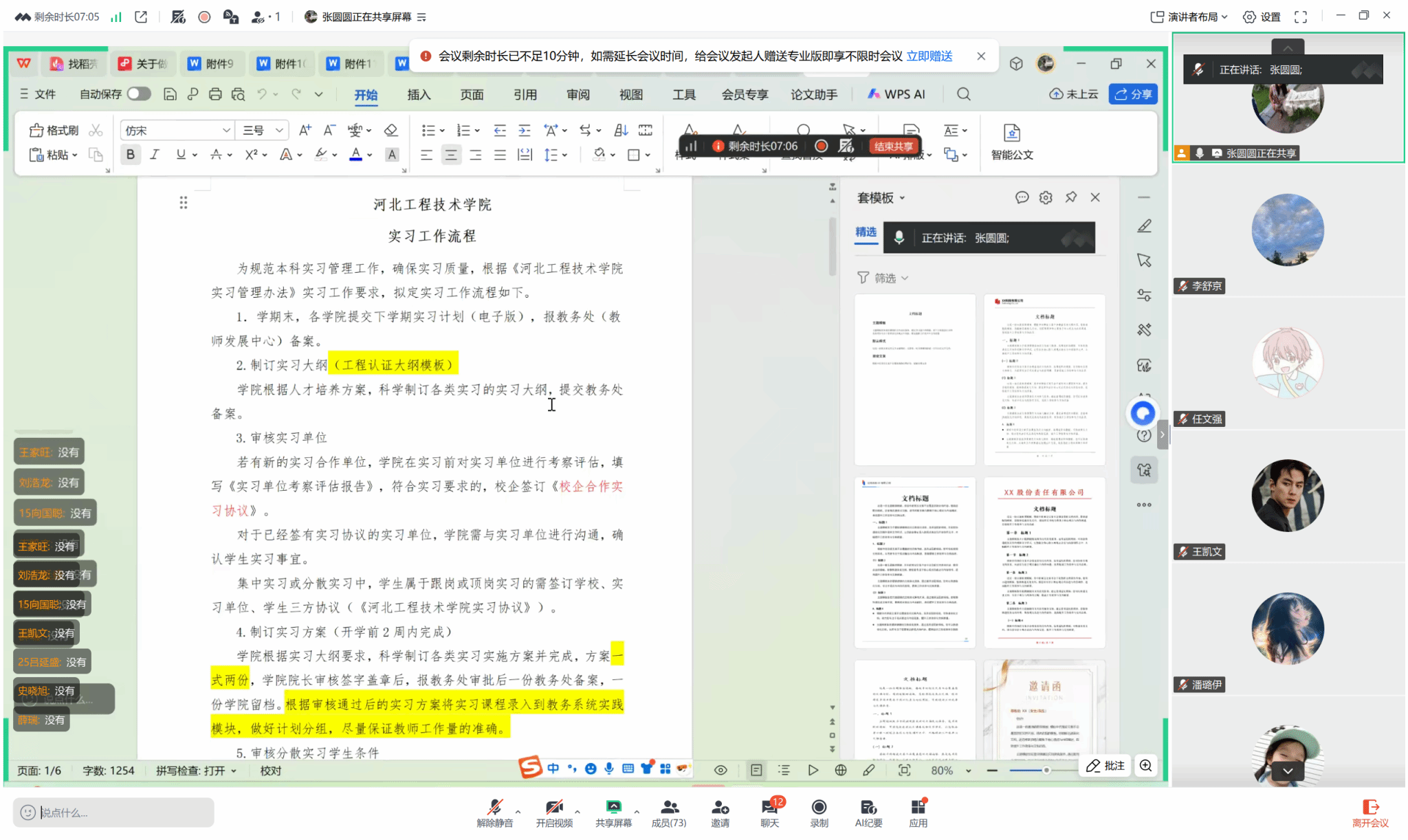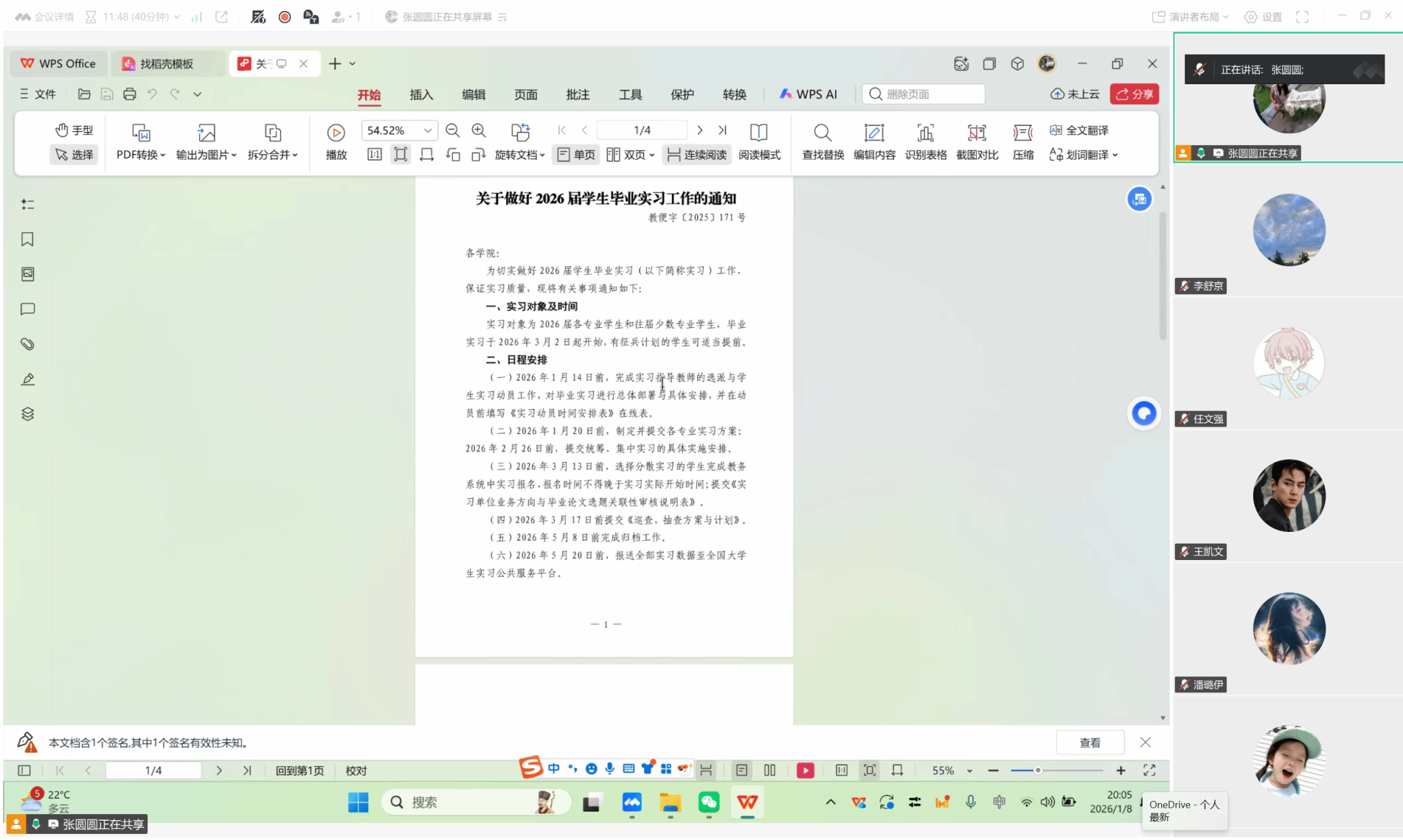 会上,张圆圆老师首先强调了毕业实习的重要意义,随后围绕实习相关文件逐一解读。她明确实习将于2026年3月2日启动,并详细梳理了关键时间节点:1月20日前需完成专业实习方案制定,3月13日前分散实习学生需完成教务系统报名及选题关联性审核,5月20日前需完成实习数据报送。