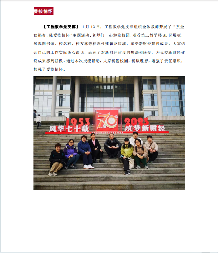 【工程数学党支部】11月13日,工程数学党支部组织全体教师开展了“赏金秋银杏,强爱校情怀”主题活动。老师们一起游览校园,观看第三教学楼AB区展板,参观图书馆、校名石、校友林等标志性建筑及区域,感受新财经建设成果。大家结合自己的工作实际谈心谈话,表达了对新财经建设的想法和感受,为我校新财经建设成果感到骄傲。通过本次交流活动,大家畅游校园,畅谈理想,增强了责任意识,加强了爱校情怀。