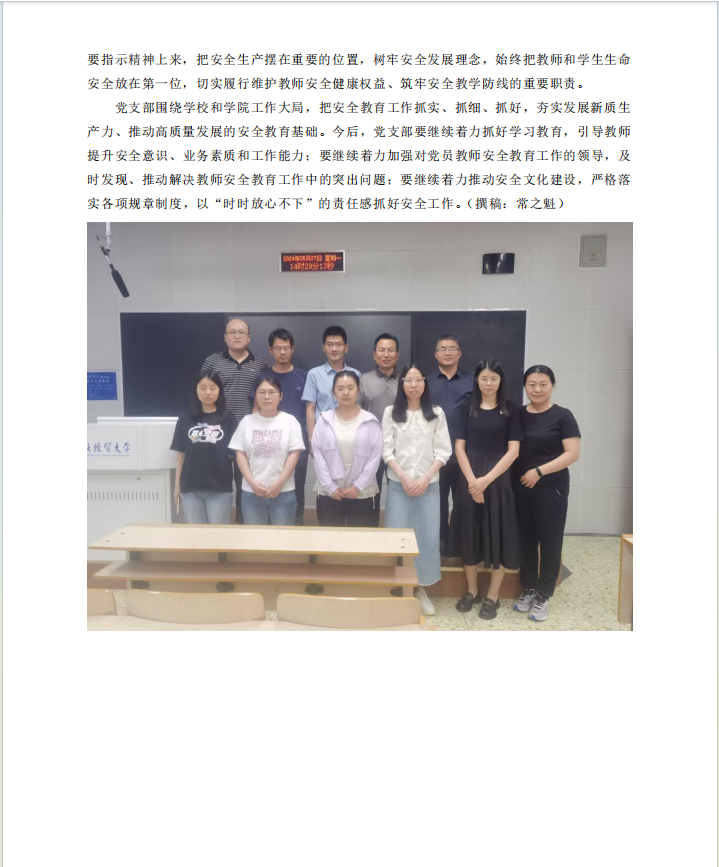 党支部围绕学校和学院工作大局,把安全教育工作抓实、抓细、抓好,夯实发展新质生产力、推动高质量发展的安全教育基础。今后,党支部要继续着力抓好学习教育,引导教师提升安全意识、业务素质和工作能力;要继续着力加强对党员教师安全教育工作的领导,及时发现、推动解决教师安全教育工作中的突出问题;要继续着力推动安全文化建设,严格落实各项规章制度,以“时时放心不下”的责任感抓好安全工作。(撰稿:常之魁)