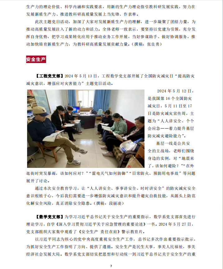【工程党支部】2024年5月13日,工程数学党支部开展了全国防灾减灾日“提高防灾减灾意识,增强应对灾害能力”主题党日活动。
