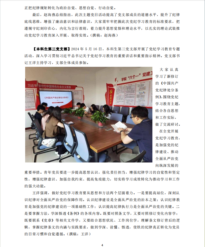 【本科生第三党支部】2024年5月16日,本科生第三党支部开展了党纪学习教育专题活动,深入学习贯彻习近平总书记关于党纪学习教育的重要讲话和重要指示精神。党支部书记王洋主持学习,支部全体成员参加。