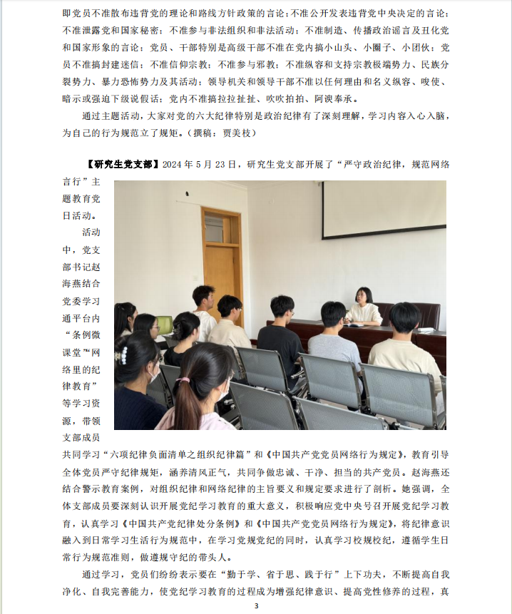 【研究生党支部】2024年5月23日,研究生党支部开展了“严守政治纪律,规范网络言行”主题教育党日活动。