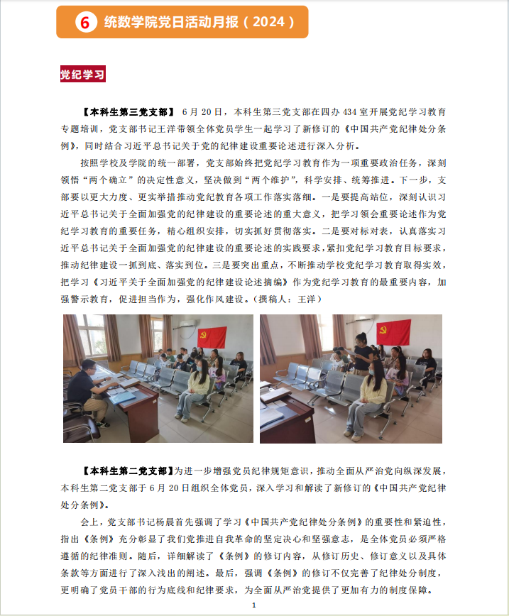 【本科生第三党支部】6月20日,本科生第三党支部在四办434室开展党纪学习教育专题培训,党支部书记王洋带领全体党员学生一起学习了新修订的《中国共产党纪律处分条例》,同时结合习近平总书记关于党的纪律建设重要论述进行深入分析。