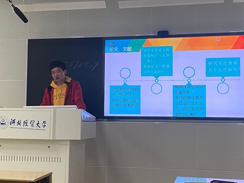 活动开始,永利官网研究生会主席韩正涛学长对本期学术沙龙进行了介绍。活动主要由学术答疑和游戏破冰两个环节组成。第一环节是为2020级研究生解答关于学习、生活、毕业、就业等方面的疑问,其目的是使2020级新生尽快适应研究生生活,并对今后的学习和生活有初步地了解。第二环节是游戏破冰。研究生自愿组队进行游戏,增进研究生之间互相了解的机会,促进研究生之间的了解。