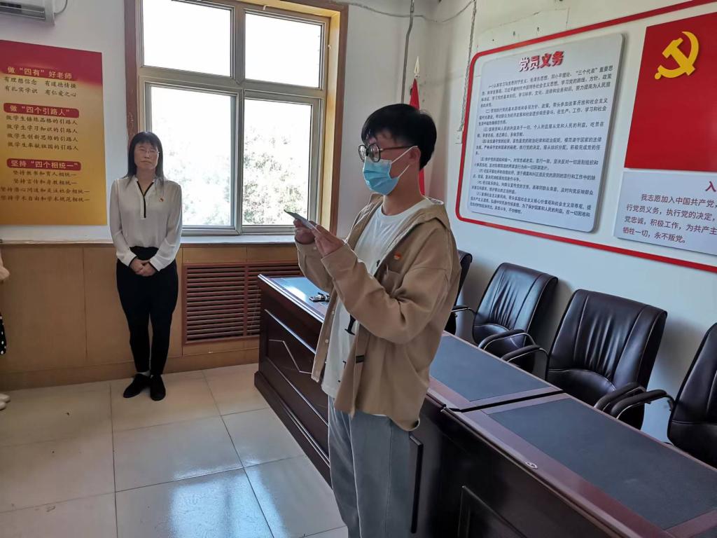 宣誓完毕,学院预备党员、学生代表袁旭羽同学代表全体新党员同学发言,表示要进一步加强党性修养,牢固树立共产主义的世界观、人生观、价值观,努力学习、努力工作,增强自己的专业技能,提高专业水平,认真履行党员义务,积极努力地完成党组织交给的任务,争做一名合格的共产党员。最后,祃海霞对新党员提出要求和希望,强调要做到“两个牢记”一是牢记党员身份,二是牢记入党初心,要时刻牢记党员第一身份,讲奉献做表率,发挥榜样力量;做到“四个大”即立大志、明大德、成大才、担大任,希望大家要勇担时代使命,勇挑重任,为党、为国家、为人民多做贡献。