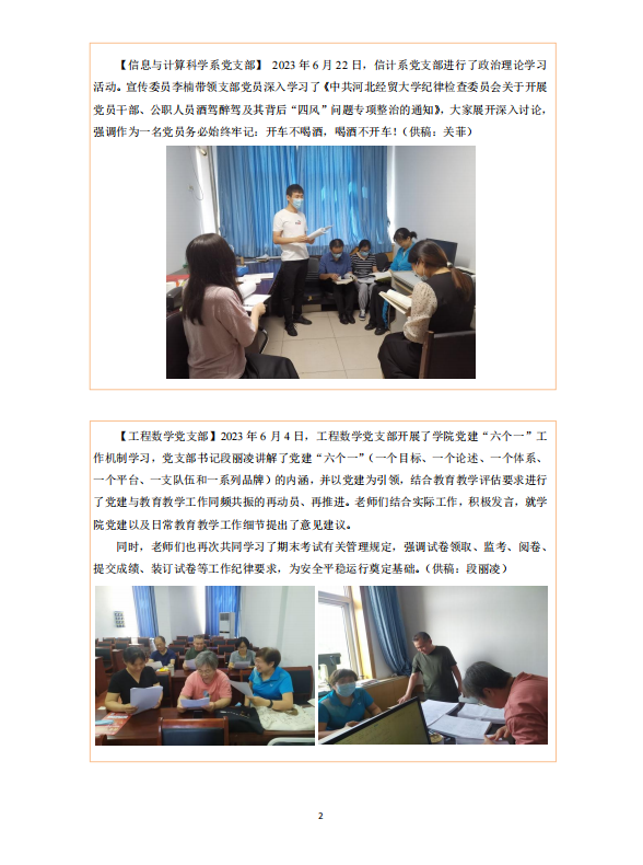 【信息与计算科学系党支部】2023年6月22日,信计系党支部进行了政治理论学习活动。宣传委员李楠带领支部党员深入学习了《中共永利集团88304官网纪律检查委员会关于开展党员干部、公职人员酒驾醉驾及其背后“四风”问题专项整治的通知》,大家展开深入讨论,强调作为一名党员务必始终牢记:开车不喝酒,喝酒不开车!(供稿:关菲)