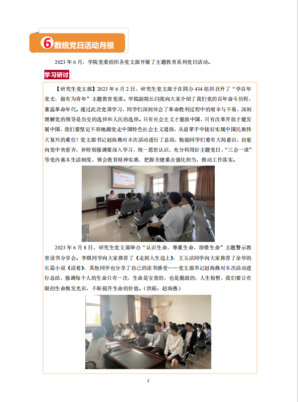 【统计学系党支部】2023年6月4日,统计学系党支部开展了学院党建“六个一”工作机制学习,通过学习加强了对党建工作的理解和认识。学习中,党支部书记申博解释了党建“六个一”的具体内涵,并结合教育教学评估要求,再次动员和推进党建与教育教学工作的有机融合。老师们积极讨论,提出了关于学院党建以及日常教育教学工作的意见和建议,结合实际工作分享了自己的经验和观点,主要包括:加强党组织建设、思想政治教育,提高教育教学质量,完善教学管理制度,加强师德师风建设,建设良好的校园文化,加强与家长和社会的沟通与合作等。这种积极参与和互动,有助于新一步推动学院党建和教育教学各项工作。(供稿:申博)