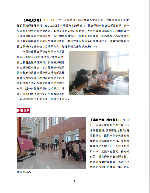 【应统党支部】10月19日下午,根据党建引领业务融合工作思路,应用统计学系党支部组织教师开展研讨,在2023级本科培养方案的基础上,结合学校审核评估所提意见,进一步凝练专业特色和建设思路,加大专业辨识度。根据统计类教学质量国家标准,应用统计学专业着重培养学生掌握在某一特定领域从事统计工作的知识和能力。培养掌握该特定领域相关学科的基础知识和统计学的基本思想、基本方法以及相关的计算机技术,能够较好地将该特定领域的专业和统计方法结合在一起进行研究并加以应用的人才。