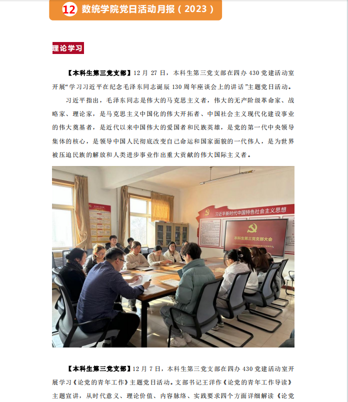 【本科生第三党支部】12月27日,本科生第三党支部在四办430党建活动室开展“学习习近平在纪念毛泽东同志诞辰130周年座谈会上的讲话”主题党日活动。