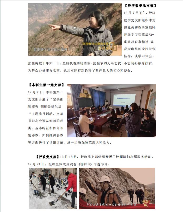 【行政党支部】12月15日,行政党支部组织开展了校园清扫志愿服务活动。12月21日,组织全体成员观看《榜样8》专题节目。