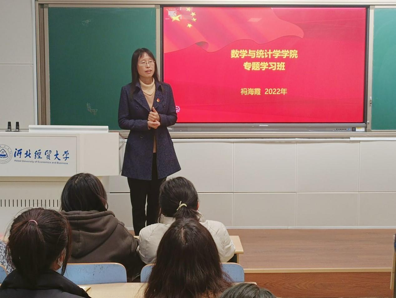 3月24日晚七点,数学与统计学学院团委于北三教A202开展以“庆祝建团一百周年、喜迎党的二十大”为主题的团日活动。此次活动特邀学院党委书记祃海霞教授为永利官网同学做专题党课辅导讲座,团委书记王洋老师和各班团员代表参加。