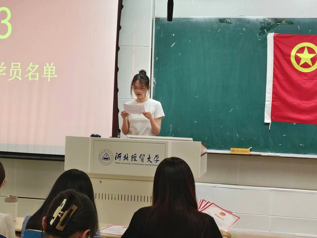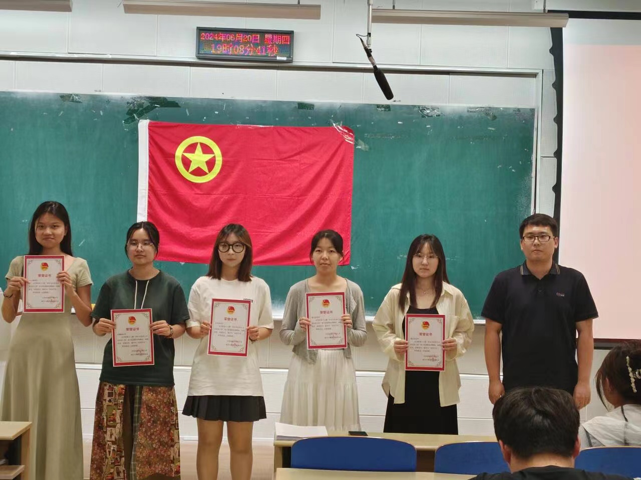 团委组织部部长郑欣悦宣读优秀学员名单,王洋老师为优秀学员颁发荣誉证书并合影留念,同时代表学院团委向获奖同学表示祝贺。