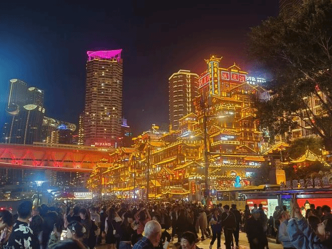 洪崖洞,洪崖洞民俗风貌区长约50米,总占地面积3.15万平方米,分为纸盐河精品古玩街、天成巷百业工坊老街、洪崖洞巴渝民俗美食街、洪崖洞异域美食街。这里的建筑不仅保留了巴渝地区传统的建筑特色,如坡屋顶、吊脚楼等,还融入了现代化的设计元素,给人一种时空交错的感觉。每一栋建筑都经过精心的设计和施工,无论是外观还是内部的结构都充满了艺术感。同学们其独特的建筑风格所吸引,还注意到了洪崖洞的建筑与自然和谐共生的关系,同学们启发颇深。