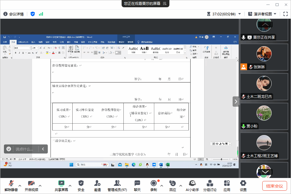 在会议中,栗莎老师详细介绍了毕业实习的具体安排、任务要求、评价标准,并明确了归档材料的规范性。她特别强调,毕业实习是连接校园与社会的重要桥梁,是学生将理论知识转化为实践能力的关键环节。因此,同学们必须高度重视此次实习,在实习期间应积极与指导教师及学院保持沟通,严格遵守学院的各项实习规定,以确保毕业实习的顺利进行。