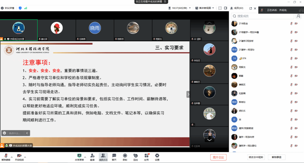 随后,指导教师代表就实习的具体安排和要求进行了详细介绍。他们强调了实习期间的安全问题,提醒同学们要严格遵守实习单位的规章制度,保持良好的职业操守。同时,教师们还就实习报告的撰写、实习成果的展示等方面给出了具体指导,帮助同学们更好地规划实习生活。