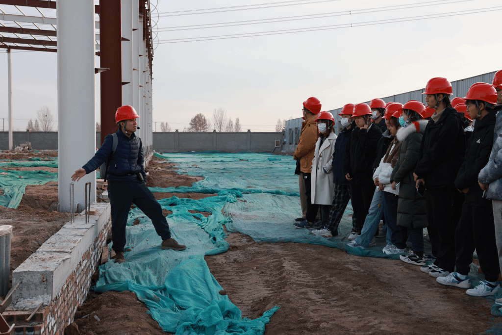 实习课程精心设计了工程现场实践环节,组织师生赴正定县塔元庄学校项目实地研学。在项目现场,施工单位河北恒山建筑工程有限责任公司白经理与监理单位华腾鸿业项目管理有限公司技术总工梁总为同学们进行了专业讲解。该项目创新性地融合了两种先进建造技术:幼儿园部分采用国际领先的被动式超低能耗建筑技术,通过高效保温系统、气密性构造和热回收装置,实现了"四恒"(恒温、恒氧、恒净、恒静)的绿色健康环境;小学部分则运用装配式建筑技术,预制构件工厂化生产、现场模块化组装,较传统工艺缩短工期30%以上,显著提升建造效率。同学们通过实地观摩智能建造技术的工程应用,对现代建筑工业化发展有了更深刻的理解。