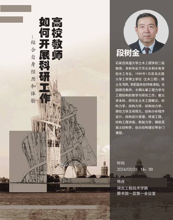 我院邀请石家庄铁道大学土木工程学院段树金教授,为我院师生进行高校教师如何开展科研工作专题讲座,此次学术报告是BEAT365官网学术活动的重要组成部分,旨在拓宽教师的学术视野,激发创新思维,促进学术交流与合作。