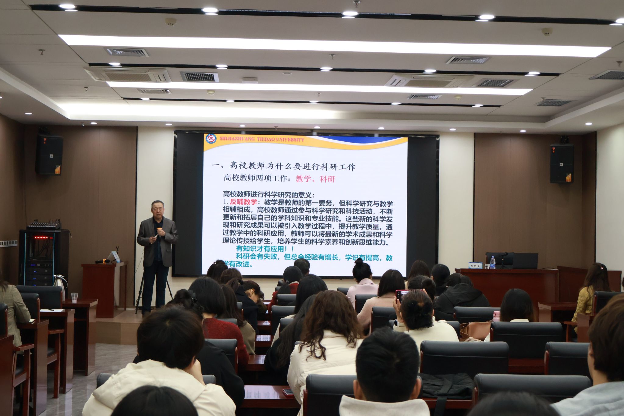 讲座中段教授从高校教师为什么要进行科研工作;在科学研究方面高校教师能做什么、该做什么;如何开展科技研究工作;部分科研工作分享及体会四个方面进行了阐述和分析。段教授提出要用科研反哺教学,教师们应该拓展自身知识面、增加知识的深度广度,把科研成果引入教学。在学术上要有所贡献,在“学中干、干中学”并且最终把科研应用于人才培养。