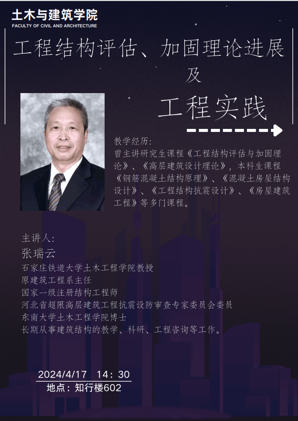 主讲人简介:张瑞云,石家庄铁道大学土木工程学院教授,原建筑工程系主任。国家一级注册结构工程师。河北省超限高层建筑工程抗震设防审查专家委员会委员。本科毕业于石家庄铁道学院,博士毕业于东南大学土木工程学院,获工学博士学位。长期从事建筑结构的教学、科研、设计及工程咨询等工作。主要研究领域为钢筋混凝土结构行为、工程结构评估与加固理论、现代结构抗震设计理论等。主持参与工程设计、结构检测、结构加固、施工监控等各种项目百余项。曾主讲研究生课程《工程结构评估与加固理论》、《高层建筑设计理论》,本科生课程《钢筋混凝土结构原理》、《混凝土房屋结构设计》、《工程结构抗震设计》、《房屋建筑工程》等多门课程。