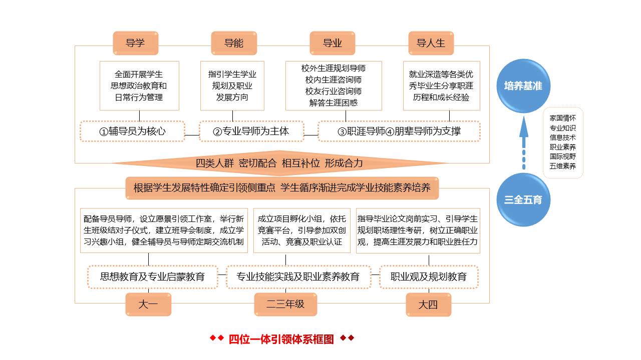 “四位一体引领育人体系”围绕“三全育人”基本要求,以学校“家国情怀+专业知识+信息技术+职业素养+国际视野”五维核心素养为基准,以辅导员为核心、以专业导师为主体、以职涯导师、朋辈导师为支撑,四类人群密切配合,相互补位,形成合力,全员全程全方位覆盖学生职业引领教育(框图如下)。