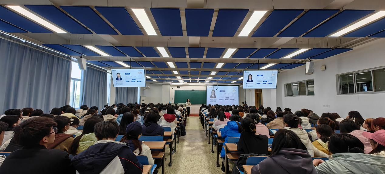 4位学生分别是保送西北大学20级统计学1班段芳琴、保送中国海洋大学20级统计学2班甄紫惠、保送中国海洋大学20级信息与计算科学1班郝一茹、保送山东大学20级应用统计学1班付佩雲,她们依次上台,就个人经历、学习成绩、科研竞赛、保研经历等方面给23级学生分享了自己求学经验和成长感悟。
