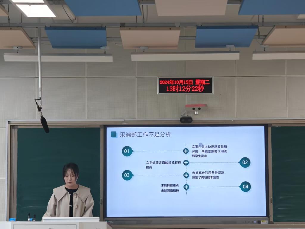 各部门首先进行了工作汇报。部长们以认真负责的态度,详细地汇报了本部门在前一阶段的主要工作、完成情况以及接下来的工作计划。接着,主席团成员就分管部门工作进行部署,要求全体学生会成员目标明确,学会自我管理具备沟通能力,积极承担责任,学会团队协作与配合,在以往工作的基础上,不断创新、追求卓越。
