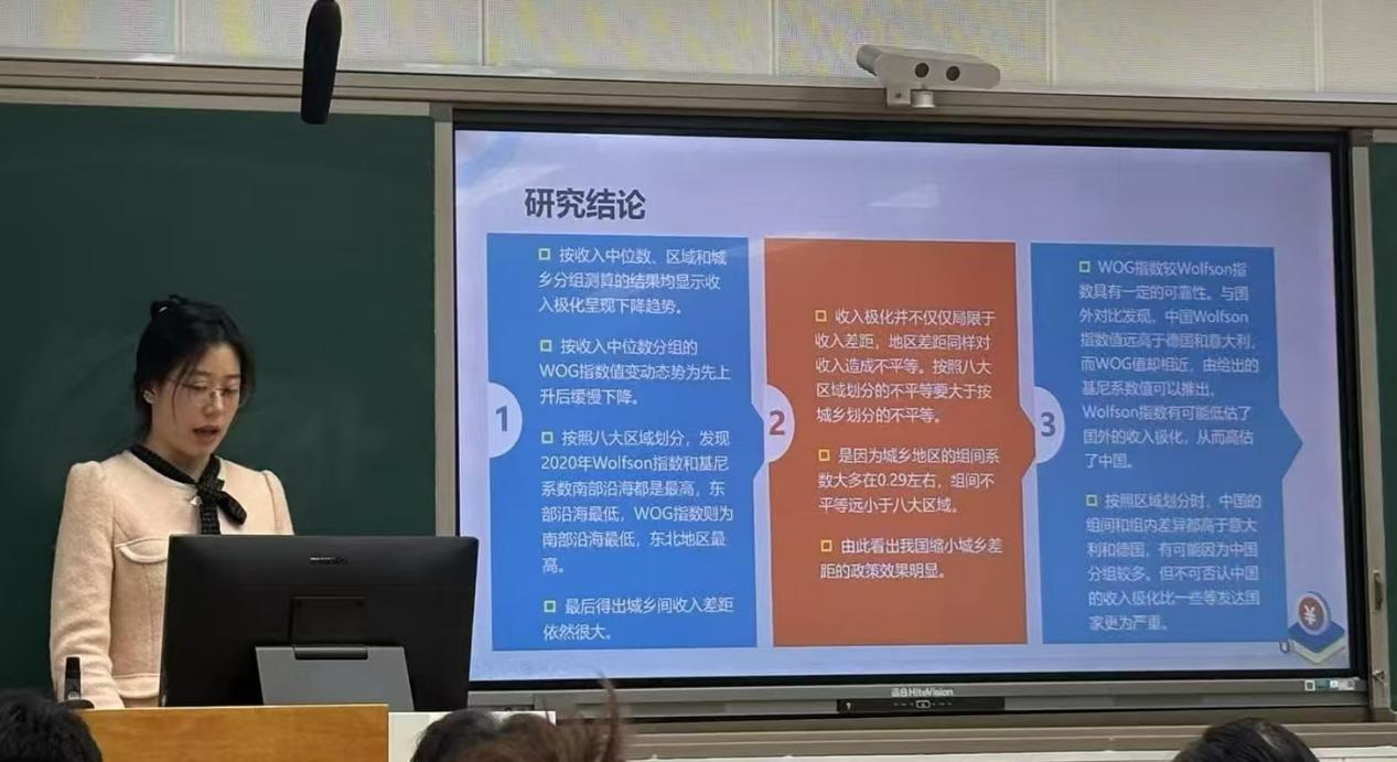 2023级应用统计专业优秀研究生吕佳琦发表报告。报告主题为“共同富裕目标下中国居民收入极化测度及分析研究——基于改进的Wolfson收入极化指数”。在报告中,她对收入极化指数进行改进创新,使数据不再限制于收入差异,并可以按照需求清晰地划分为多组进行对比观测,从收入中位数、地区、城乡等多个角度切入,将研究结果与国内外同类研究进行横向比较,为实现共同富裕目标提供新的思路。