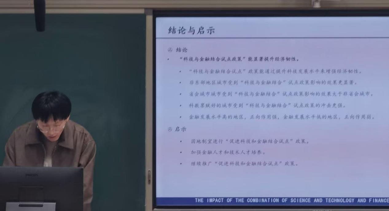 2024级统计学专业优秀研究生王子豪发表报告。报告主题为EMPIRICALEVIDENCE BASED ON QUASI-NATURAL EXPERIMENT OF "PROMOTING THE COMBINATION OF SCIENCE AND TECHNOLOGY AND FINANCE"。在报告中,他深入探讨了“促进科技和金融结合试点”政策对经济韧性的影响,并提出这一政策对于增强经济的适应性和恢复力具有积极作用,这对于促进经济的可持续发展具有重要现实意义。
