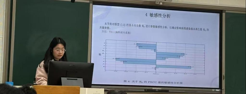 2023级应用统计专业优秀研究生陈若彤发表报告。报告主题为“一类具有饱和发生率的流感SVEI1I2RS传染病模型”。在报告中,陈若彤研究了一类具有饱和发生率的SVEI1I2RS的流感病毒传播动力学模型。最终,确定了疫苗影响因子与人口输入量这两个核心要素,作为影响基本再生数的关键因素,并提出针对性意见。