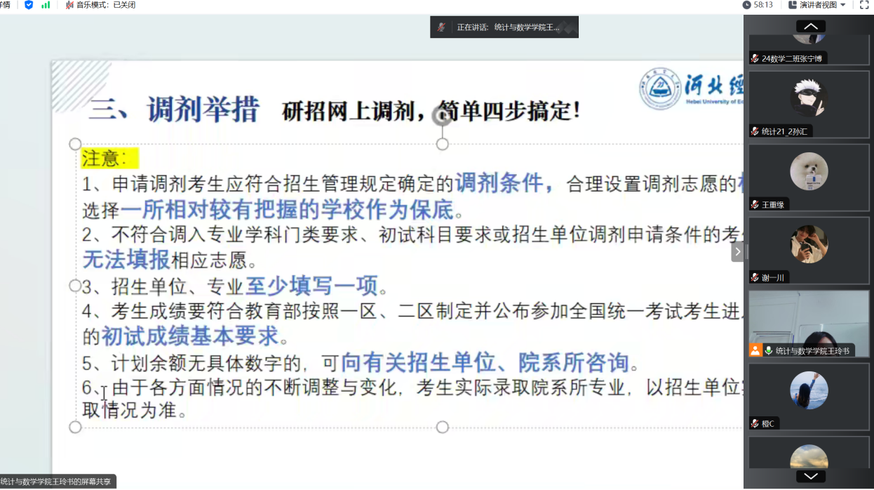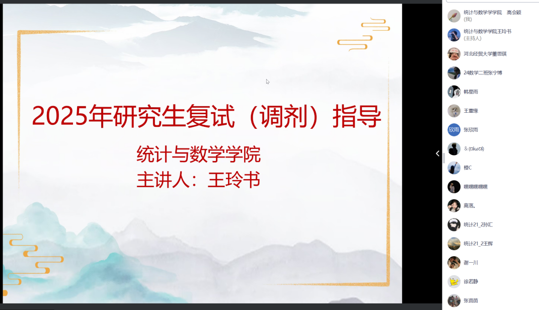 3月10日,永利集团88304官网召开“2025年研究生复试(调剂)指导会”线上会议,由学院副院长王玲书主讲,2021级考研学生参加。