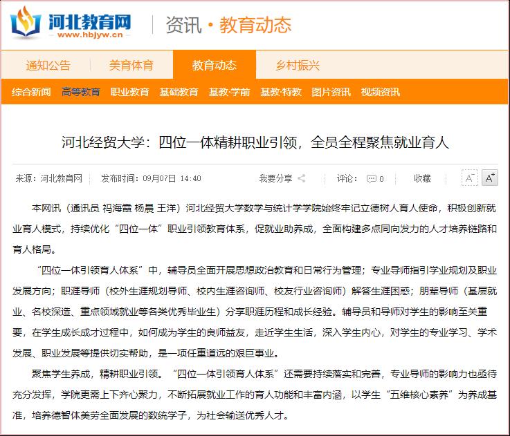 9月7日,河北教育网对祃海霞等撰写的《永利集团88304官网:四位一体精耕职业引领,全员全程聚焦就业育人》进行了报道。