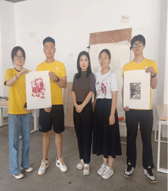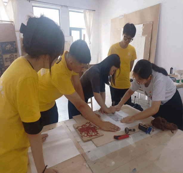 延安大学鲁艺学院于2010年11月,被教育部批准为“高等学校红色经典艺术教育示范基地”,因此在延安的最后一程,我们来到延安大学鲁迅艺术学院,在这里我们邀请到鲁迅艺术学院版画教师郭丽娟老师,郭老师待人亲和,她先带我们参观了学院的院史馆和画室,并对部分毕业生的留校作品进行了详细的介绍,随后她带我们来到她的工作室进行学习,从选稿、描稿、刻板、拓印,详细讲解并示范了木刻版画的创作过程,在老师的指导下我们小队成员也当场进行了学习体验,并共同完成一幅作品;郭丽娟介绍到:老鲁艺不仅在木刻上有很多优秀作品,漫画、雕塑、新连环画、剪纸等也发展迅速,在抗日战争与解放战争时期,都曾有效地起到了宣传革命信仰、凝聚民族战斗力的作用,成为抗日战线上的“特殊的武器”;作为新时代青年,我们在回望并学习鲁艺精神的同时,要立足当代生活,坚持“以人民为中心”的创作导向,讲述新时代的中国故事,刻画新时代的人民形象,弘扬新时代的审美风尚。