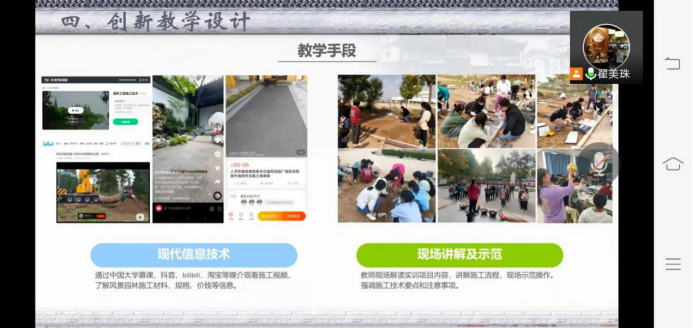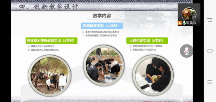 第二部分,翟老师介绍了课程的教学创新设计。从调研省内高校风景园林工程实践课的问题着手,提出了四个问题。一是实践项目单一,以绘制施工图为主。二是缺乏实操性。三是教学成果与企业需求脱节。四是教学评价的局限性。基于这些问题,在我们开设这门课时,就要更加注重它的实用性、创新性、可操作性和科技性。我们的课程一定要让学生在真实的项目、真实的环境中去操作。因此,提出了“两个传承、两个引进、两个创新”的教学理念以及“专业技能+四育”的教学特色。通过风景园林工程训练强调“实践是检验真理的唯一标准”,通过工程实践检验设计方案的科学性和合理性,通过传承中国的造园技艺,宣传“大国工匠精神”,培养学生们的爱国主义情操,体现“课程思政”。工程训练课最大的特点是现场实操,这体现了劳动教育。风景园林本身就是一门追求美的学科,在施工中我们要将“美”体现在每一处园林风景中。这里我们将美育融入其中,在施工的过程中,教导学生不能偷工减料、以次充好,要严把质量关,培养学生精益求精的职业道德品质。结合习主席提出的“绿水青山就是金山银山”的生态理念,将其融入到实训项目中;结合教育部提出的建设“新工科”、“建设中国金课”、打造“一流课程”等理念,以及学校的现状进一步改进和完善课程内容,从而确定了适合本校学生的三项实训内容,即园路铺装、园林树木整形修剪、土球包装。采用现场讲解及示范结合现代信息技术的教学方法。在教学评价阶段,每个实训项目完成后我们都会进行小组自评,分享经验、遇到的问题及解决办法。再进行小组间的互评,最后教师再进行点评和总结。课程的最终成绩是由学生在实训中的表现、完成度、成果质量、实训报告撰写情况等综合做出得分,再由各项目所占的比例累加得分。