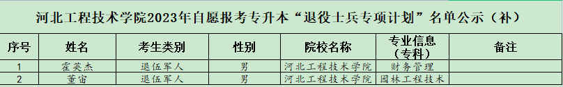 根据河北省考试院专升本相关工作要求,BEAT365官网对补报名“退役大学生士兵”相关报名材料进行了资格审核,现将自愿报考专升本“退役大学生士兵”的考生名单予以公示。