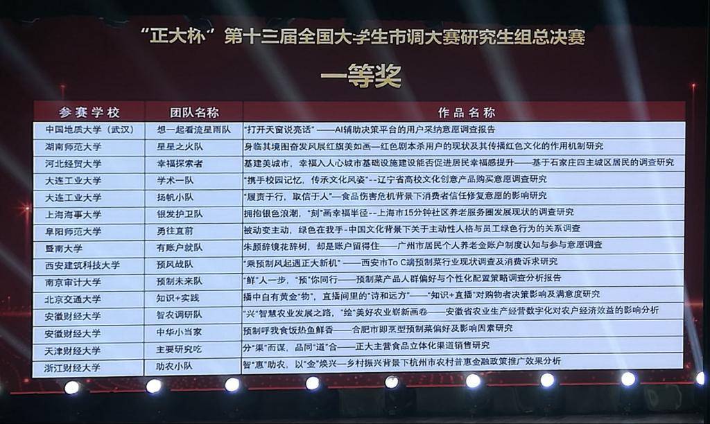 “正大杯”第十三届全国大学生市场调查与分析大赛研究生组总决赛于2023年5月13日至14日在南昌大学举行,该赛事自2019年起已连续入选教育部高校学科竞赛排行榜,是国内一流的全国性大赛,得到政府、企业和高校教师和学生的积极支持,也是海峡两岸市场调查、统计与分析教学实践平台的重要组成部分。作为一项备受关注的全国性大赛,本次比赛旨在鼓励大学生深入学习和实践,提升问题意识和解决问题的能力,本次大赛研究生组总决赛采取报告通讯评审和现场答辩相结合的竞赛方式。来自学界业界共40位专家组成的8个答辩评审组,对参加总决赛的151支团队进行了评审打分,评出总决赛一等奖72项,二等奖79项,以及晋级公开赛的9支团队。