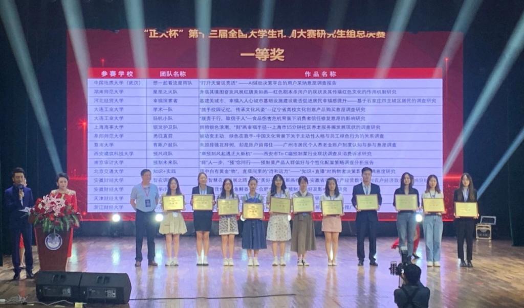 我校由宋盈盈、李泽锴、高理圆、陈怡静、张宏玥五位同学组成的“幸福探索者”团队,在比赛中以出色的表现和卓越的研究成果脱颖而出,最终荣获“正大杯”第十三届全国大学生市场调查大赛研究生组总决赛一等奖,团队作品名为《基建美城市,幸福入人心:城市基础设施建设能否促进居民幸福感提升——基于石家庄四主城区居民的调查研究》(指导教师:张子贤、郭立硕、宋晓刚)。