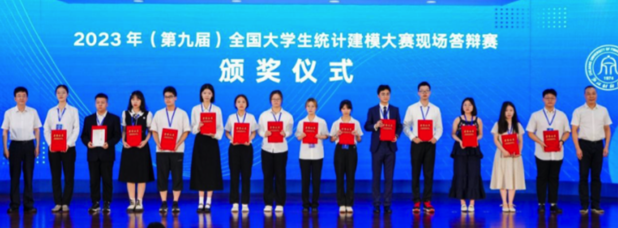 2023年(第九届)全国大学生统计建模大赛自2月开赛以来,全国27个赛区11213支队伍提交论文参赛,600支队伍入围全国赛,其中本科生组397支,研究生组203支。我校共有41支队伍参赛,其中本科生组19支队伍,研究生组22支队伍,最终本科生组获得国家一等奖1项、省级一等奖5项、省级二等奖2项、省级三等奖2项,研究生组获得省级一等奖2项、省级二等奖1项、省级三等奖5项,获奖名单如下: