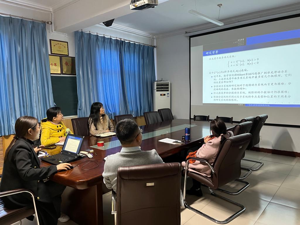 10月21日(星期四)下午,永利集团88304官网“双百论坛”暨数统论坛系列讲座在四办405举行,数学与统计学学院赵倩倩作标题为《一类非光滑系统的极限环分支》的学术报告。祃海霞书记与相关专业教师及研究生近20人参加,闫亮副院长主持报告会。