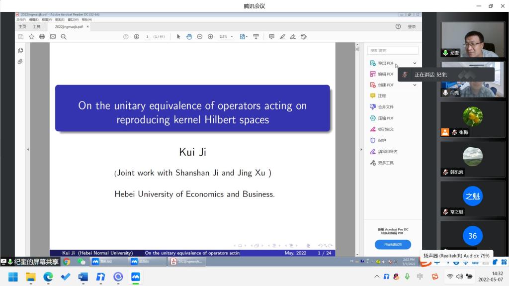 5月7日下午,数学与统计学学院邀请河北师范大学博士生导师纪奎教授在线作题为《On the unitary equivalence of operators acting on reproducing kernel Hilbert spaces》的学术报告。报告由数学与统计学学院副院长闫亮主持,学院多名师生参加。