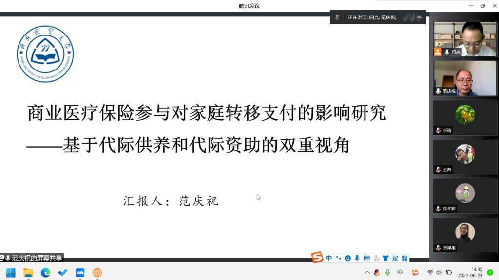 6月23日下午,数统学院邀请金融学院范庆祝副教授在腾讯会议平台作题为《商业医疗保险参与对家庭转移支付的影响研究——基于代际供养和代际资助的双重视角》的学术报告。报告由数统学院副院长闫亮主持,30余名教师和学生参加。