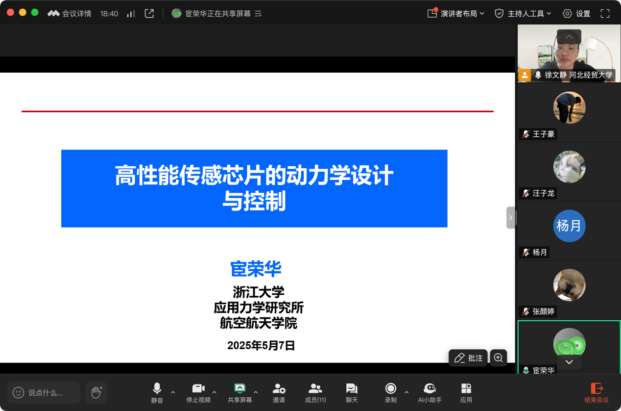 5月7日下午,浙江大学宦荣华教授应永利集团88304官网邀请在线上作题为“高性能传感芯片动力学设计与控制”的学术报告,相关专业师生20余人参会。